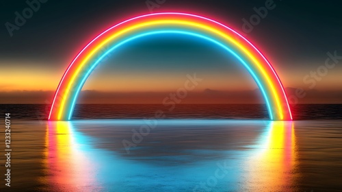 Neon Rainbow Arch Over Tranquil Ocean Sunset