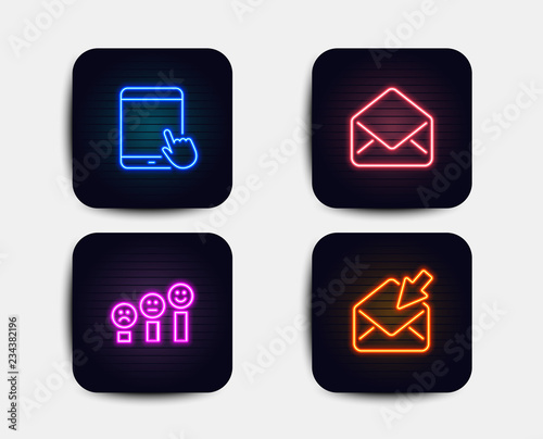 Neon set of Mail, Customer satisfaction and Tablet pc icons. Open mail sign. E-mail, Happy smile chart, Touchscreen gadget. View e-mail. Neon icons. Glowing light banners. Mail vector