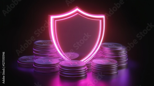neon shield icon surrounding a stack of coins, representing the concept of financial security and protection of wealth.
