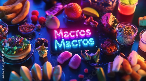 Neon sign "Macros Macros" surrounded by various healthy foods, including fruits, vegetables, nuts, and seeds, in a vibrant, colorful setting.