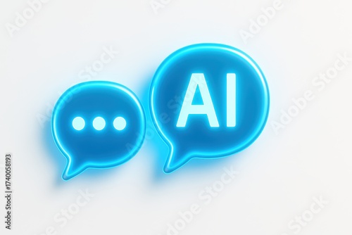 Neon Speech Bubbles with Dots and AI Text in Blue Lighting on White Background
