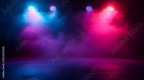 Neon stage lights, smoky backdrop, concert venue, empty