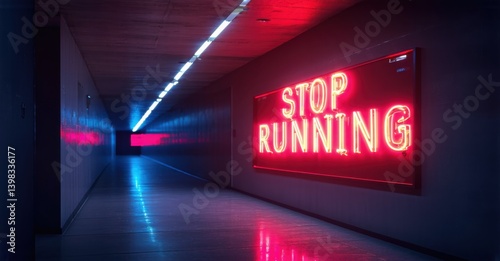 Neon stop running sign glowing blood red in narrow corridor deep navy and bright silver symbolizing relentless pursuit