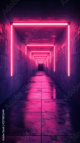 Neon-lit corridor with reflections creates an atmospheric and futuristic ambiance in a dark space