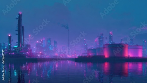 Neon-lit industrial cityscape by water at twilight