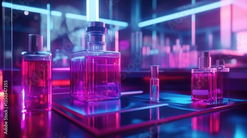 Neon-lit Perfume Bottles on Reflective Surface