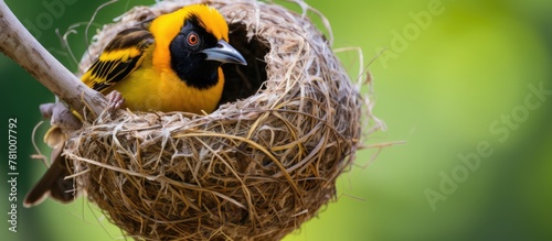 Nesting birds, one yellow and black, perching in a cozy nest on a sunny day