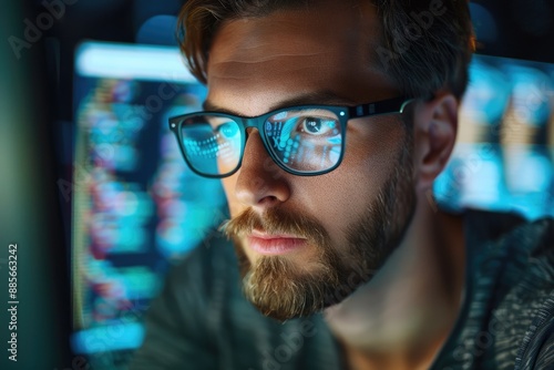 Network Analyst: Young Professional Businessman Analyzing Coded Data on Computer Screen