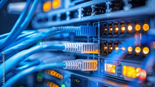 Network Attached Storage server rack with ethernet cables and flashing lights. Concepts. big data, cloud computing, database, internet technology.