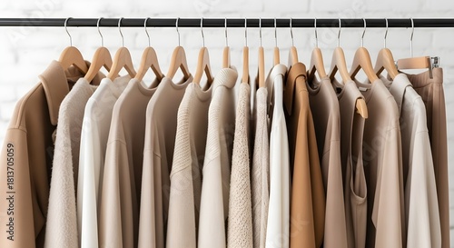 Neutral Clothing Close-up on Hangers, Minimalist Wardrobe Aesthetic, Beige and Cream Clothes on Rail