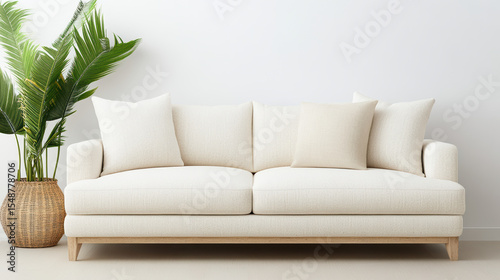 Neutral toned couch with plush cushions sits elegantly against white wall, complemented by green
