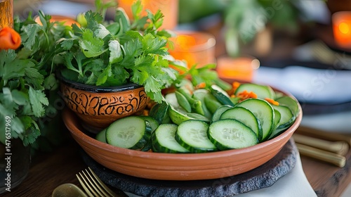 Neutral-toned table setting with spicy cucumber dish centerpiece