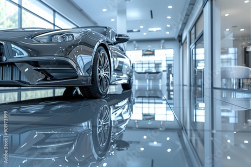 New black sportscar reflecting on showroom floor
