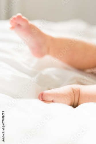 New born baby feet on white blanket on bedroom top view. Child and innocence