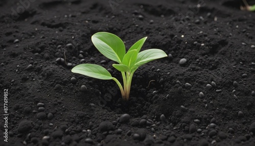 New concept of gardening: A young green plant emerging from rich black soil