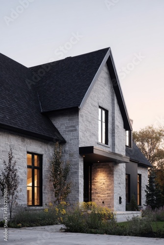 New house with stone exterior and large windows during evening light in a residential area surrounded by trees and a well-kept yard