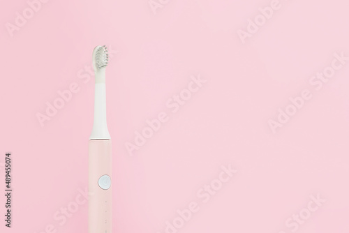 New modern ultrasonic toothbrush. Jaw model and dental care supplies on pink pastel background. Oral hygiene, dental and gum health, healthy teeth. Dental products Ultrasonic vibration toothbrush.