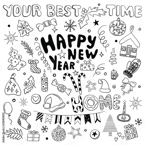 New Year and Christmas hand drawn vector icons. Big doodle set collection. The inscription Happy New Year, home and your best time. Candle, mittens, sweets, stars, gifts, toys, berries of holly, etc.