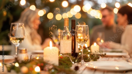 New year celebration dinner with candles, wine glasses, and festive decorations creating a warm atmosphere for a cozy gathering with friends during the holiday season