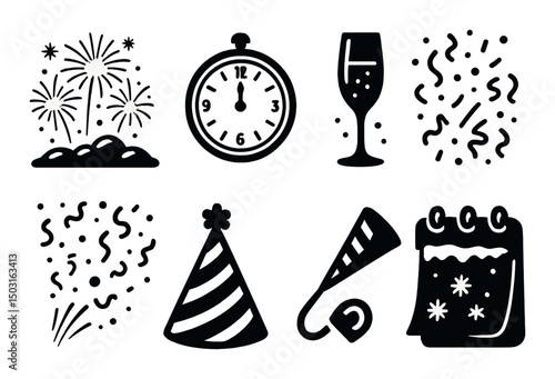 New year celebration silhouette icons set – festive, party and holiday symbols