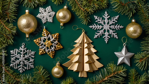 New Year's decorations elegantly arranged on a wooden surface, featuring sparkling ornaments, twinkling lights, and festive ribbons.