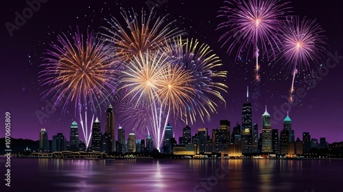 New Year's scene, the purple background serves as a dramatic backdrop to golden fireworks spelling