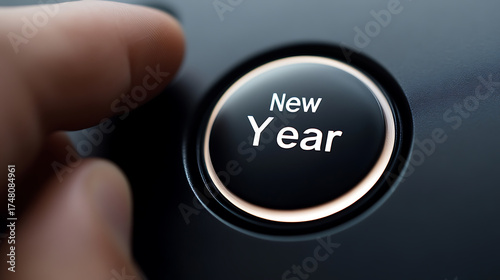 New Year's start button is being pressed to welcome the new year. The button is black with white text, finger pushing the button symbolizes new beginning.