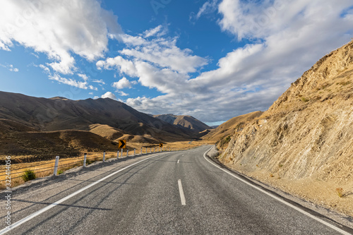 New Zealand, Clouds over empty State Highway 8 in Lindis Pass