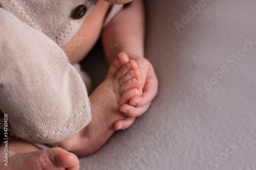 newborn baby holds its leg in bed. baby feet