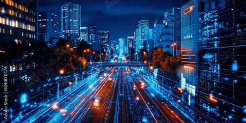 Night cityscape with bright blue and neon light streaks overlaying skyscrapers