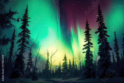 Night landscape of northern lights in winter polar forest