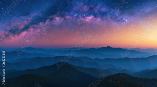 Night landscape with colorful milky way and yellow light on mountains Starry sky with hills