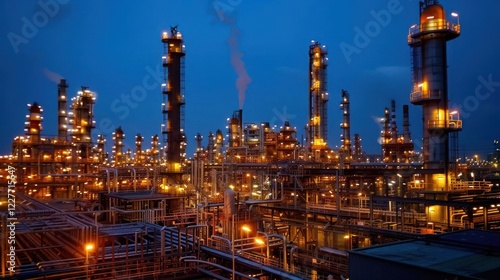 Night view of an industrial complex with illuminated structures and smoke emissions