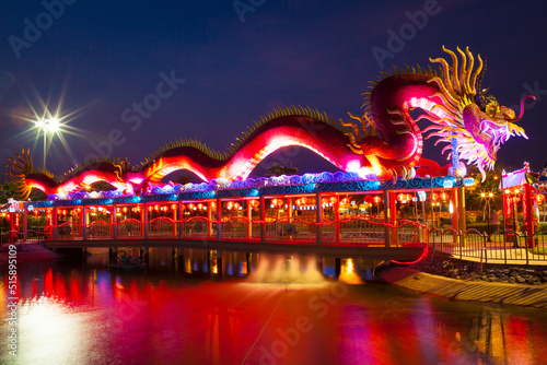 Night view of full color lighting decorate on dragon statue, Chonburi province, Thailand.