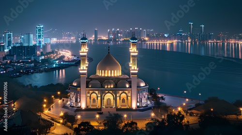 Night view of the mosque overlooking the city lights and the strait