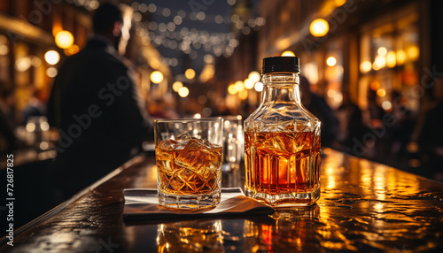 Nightclub bar, men drinking whiskey, city lights illuminate celebration generated by AI