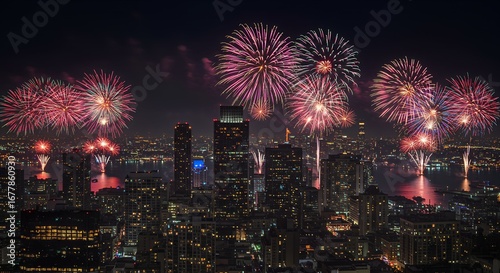 Nighttime cityscape with vibrant fireworks exploding over skyscrapers in a dark sky