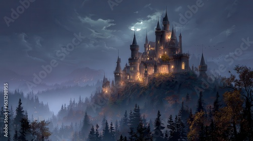 Nighttime Fantasy Castle on Foggy Hilltop