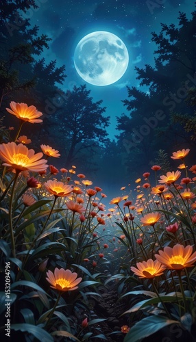 Nighttime garden with glowing flowers illuminated by the full moon in a serene forest