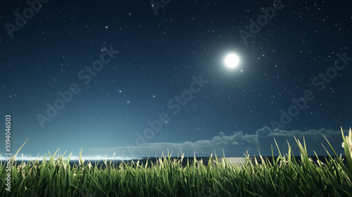 Nighttime Serenity: A breathtaking panorama of a moonlit night, with a full moon illuminating the vast, star-studded sky above a field of tall grass. The scene evokes a sense of peace and tranquility.