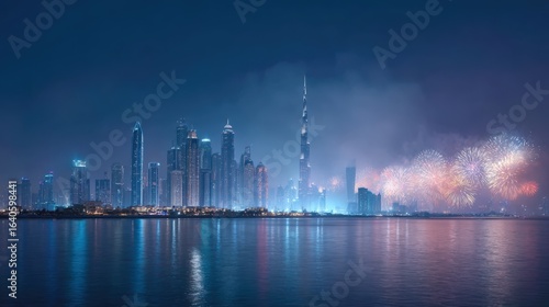 Nighttime Skyline of Dubai with Fireworks Display Over the Water Reflecting City Lights