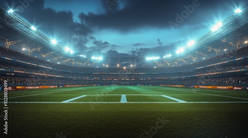 Nighttime soccer stadium illuminated with bright lights and excited crowd before the match