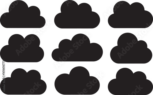 Nine black cloud shapes on a white background clouds