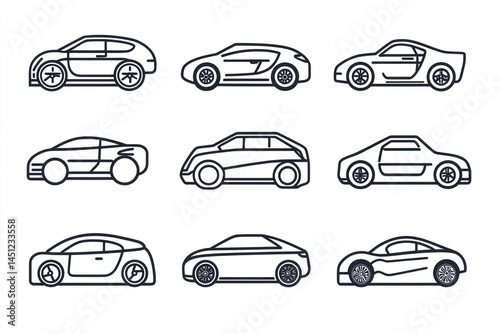 Nine car design icons; white background; automotive industry; website graphics