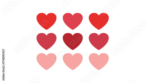 Nine heart vector icon set. Flat design in red and pink shades. Symbol of love, passion, romance for Valentine's Day, wedding, anniversary. Modern simple graphic element.