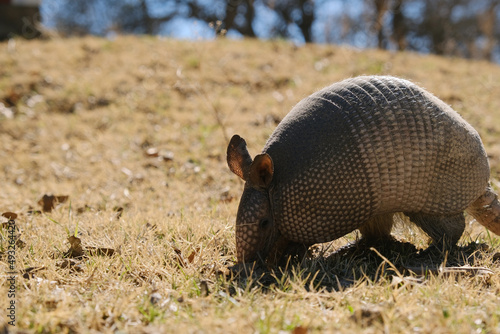 Nine-banded armadillo digging in dry winter grass close up on hill.