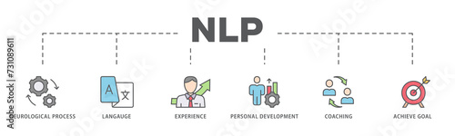 NLP banner web icon illustration concept for Neuro-linguistic programming with icon of neurological process, langauge, experience, personal development, coaching, and achieve goal