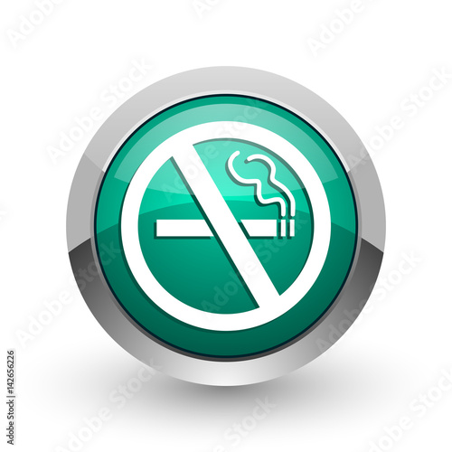 No smoking silver metallic chrome web design green round internet icon with shadow on white background.