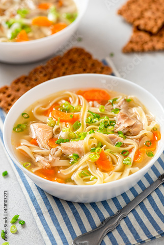 Noodle soup. Homemade soup with chicken broth, carrots and noodles in a bowl on a gray concrete background. Delicious autumn or winter soup.