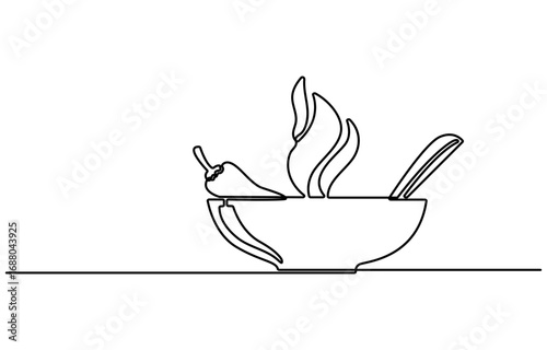Noodles in the bowl, Bowl Spoon And Vegetables Children Food,Bowl Fire,Bowl With Spoon outline drawing illustration. one continuous line drawing of ramen noodles with chopstick.